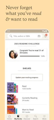 Η εξερεύνηση νέων κόσμων δεν ήταν ποτέ ευκολότερη. Με το Goodreads, μπορείτε να σκανάρετε αμέσως εξώφυλλα βιβλίων και να έχετε πρόσβαση σε κριτικές, προσθέτοντάς τα στην προσωπική σας λίστα 'Θέλω να Διαβάσω' με μια μόνο κίνηση. Απολαύστε εξατομικευμένες προτάσεις που βασίζονται στα μοναδικά σας γούστα, ανακαλύπτοντας τίτλους που σίγουρα θα λατρέψετε. Περιηγηθείτε σε επιλεγμένες κατηγορίες και είδη, ή δείτε τι διαβάζουν οι φίλοι σας για να εμπνευστείτε και να επεκτείνετε τους αναγνωστικούς σας ορίζοντες.