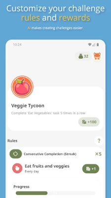 Αυτό που κάνει το Habit Tracker: Goals & Rewards μοναδικό είναι η δυνατότητα να δημιουργείτε και να προσαρμόζετε τις δικές σας ανταμοιβές, από μια ημέρα περιποίησης μέχρι μια νέα αγορά, ορίζοντας την αξία τους σε πόντους. Επίσης, μπορείτε να θέσετε πιο φιλόδοξες προκλήσεις, όπως διαδοχικές καθημερινές ολοκληρώσεις ή επανάληψη μιας εργασίας συγκεκριμένες φορές, κερδίζοντας επιπλέον πόντους ή μοναδικά εμβλήματα ως αναγνώριση των επιτευγμάτων σας. Ακόμη και οι ανεπιθύμητες συνήθειες μπορούν να αντιμετωπιστούν αποτελεσματικά: απλά ορίστε απώλειες πόντων για αυτές, κάνοντας τον αρνητικό τους αντίκτυπο άμεσα ορατό και ενισχύοντας την προσπάθειά σας να τις περιορίσετε.