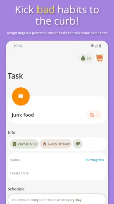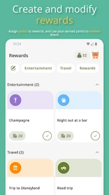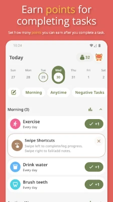Η δημιουργία θετικών συνηθειών και η διατήρηση της οργάνωσης δεν ήταν ποτέ τόσο συναρπαστική. Το Habit Tracker: Goals & Rewards μεταμορφώνει τους καθημερινούς σας στόχους σε ένα διασκεδαστικό παιχνίδι, όπου κάθε επιτυχία επιβραβεύεται. Είτε πρόκειται για την αύξηση της πρόσληψης νερού, την τακτική άσκηση ή την πρακτική ενσυνειδητότητας, μπορείτε εύκολα να καθορίσετε και να προγραμματίσετε εργασίες, αποδίδοντας τους πόντους. Κάθε φορά που ολοκληρώνετε μια συνήθεια, κερδίζετε τους αντίστοιχους πόντους, οδηγώντας σας πιο κοντά στις επιθυμητές επιβραβεύσεις που εσείς έχετε ορίσει.